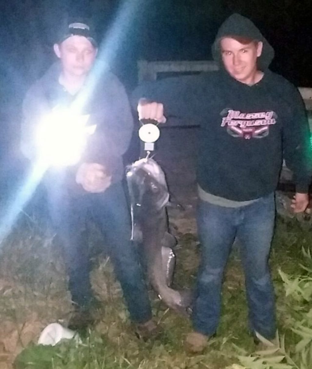 Colton Scott (left) and Matt Pfeiffer (right) caught a 13-pound catfish in Port Washington, Ohio on June 14, 2019.