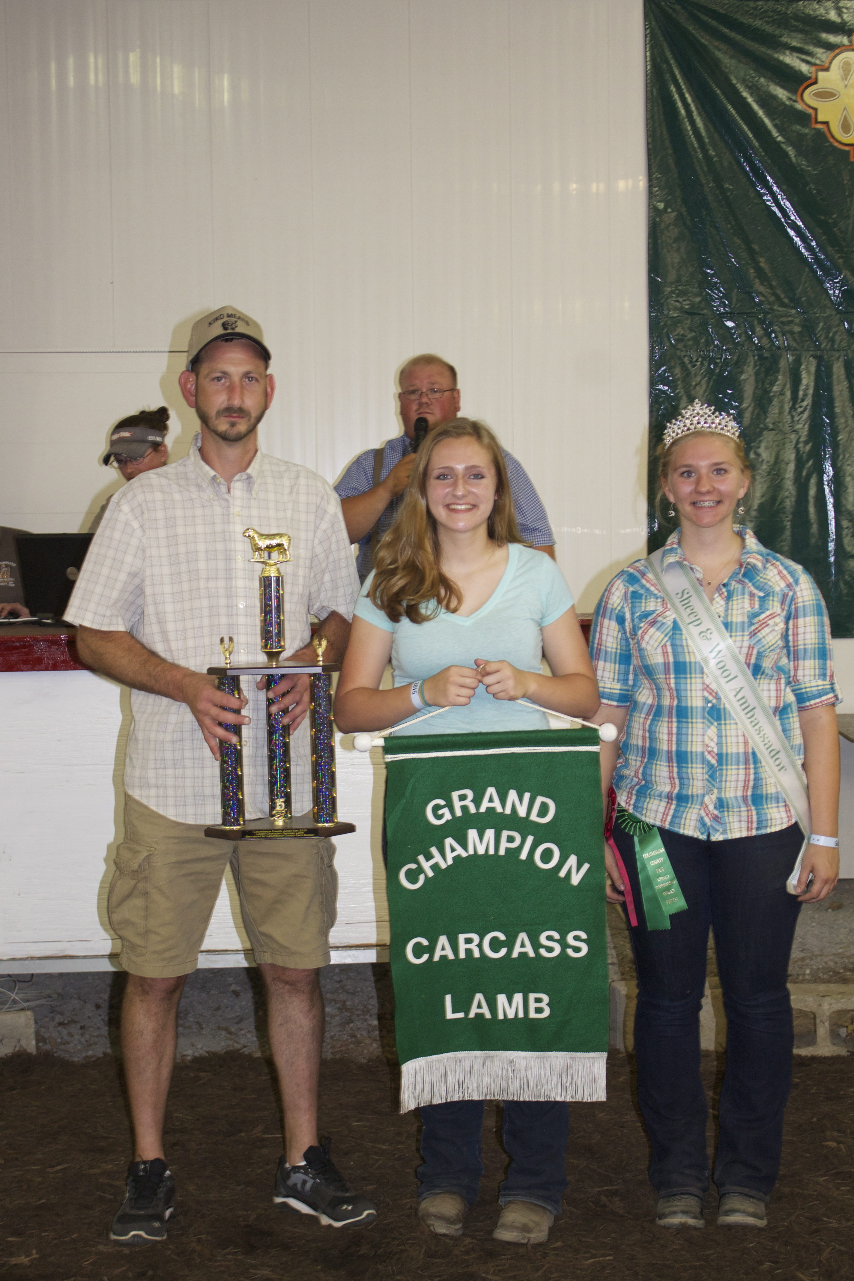 The grand champion carcass lamb was raised by Sarah Jarvis. Jarvis garnered $4.85 a pound for her lamb which was purchased by Kiko Meats. Pictured is Steve Kiko and 2015 Columbiana County Sheep and Wool Ambassador Becca Bock.