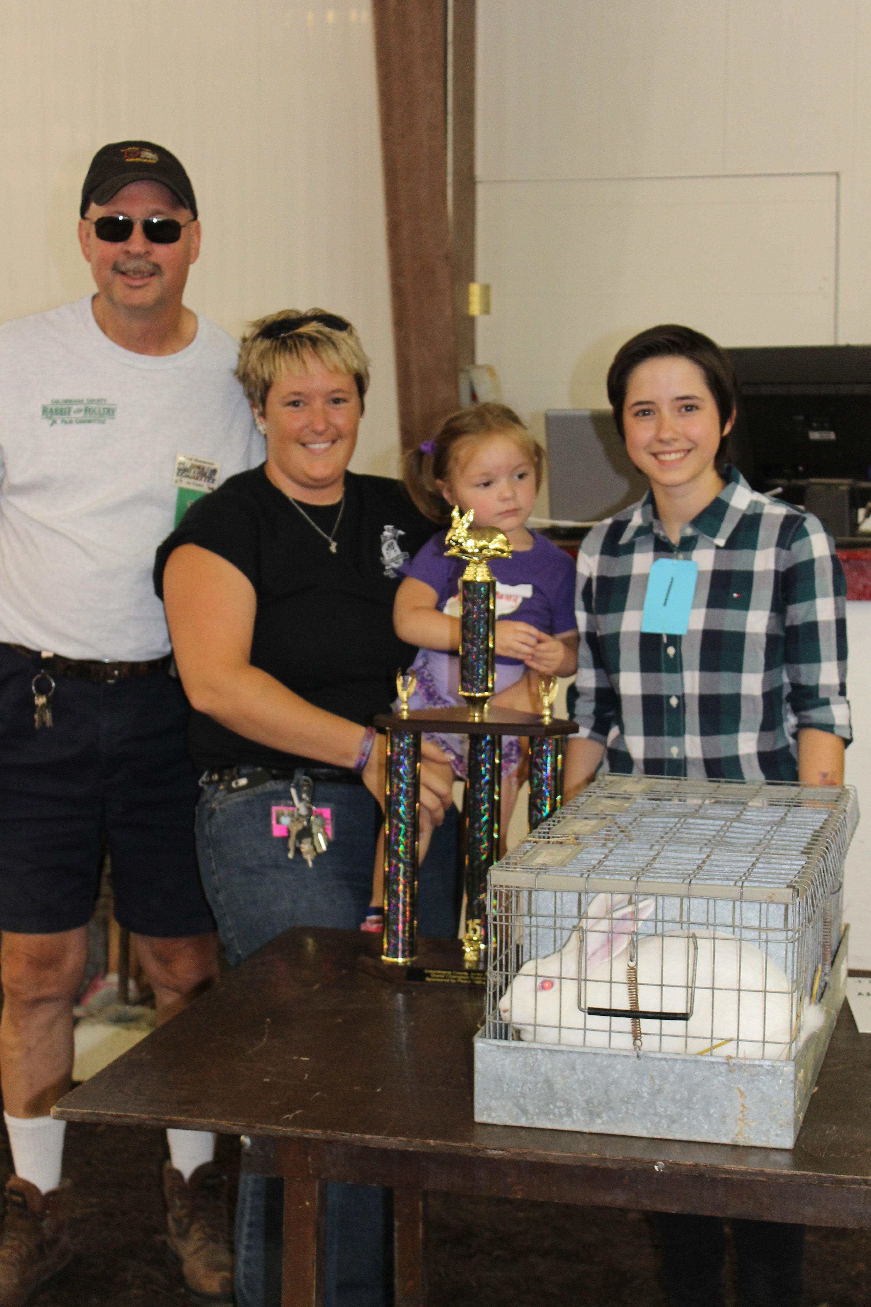 The grand champion market rabbit was raised by Cody Wright at this year’s Columbiana County Fair. Wright’s rabbit pen of three weighing 14.01 pounds sold for $150 per rabbit. Penn Ohio Rabbit Breeders purchased the pen. Pictured is Dan Matthews.