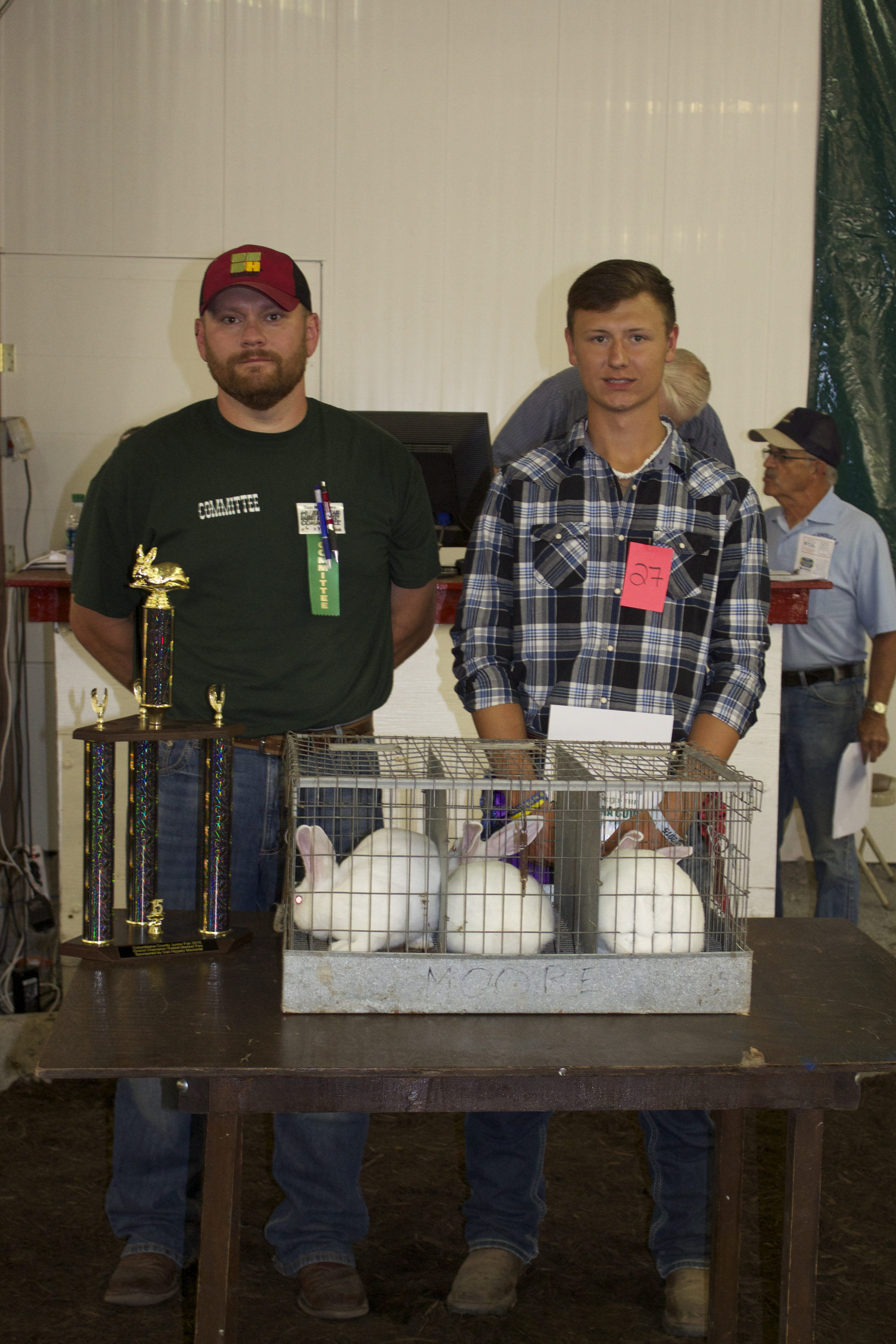 The reserve champion pen of market fryer rabbits weighing 5.29 pounds was raised by Mickalia Ayers and sold for $150 to Penn Ohio Rabbit Breeders. Pictured is Dan Matthews.