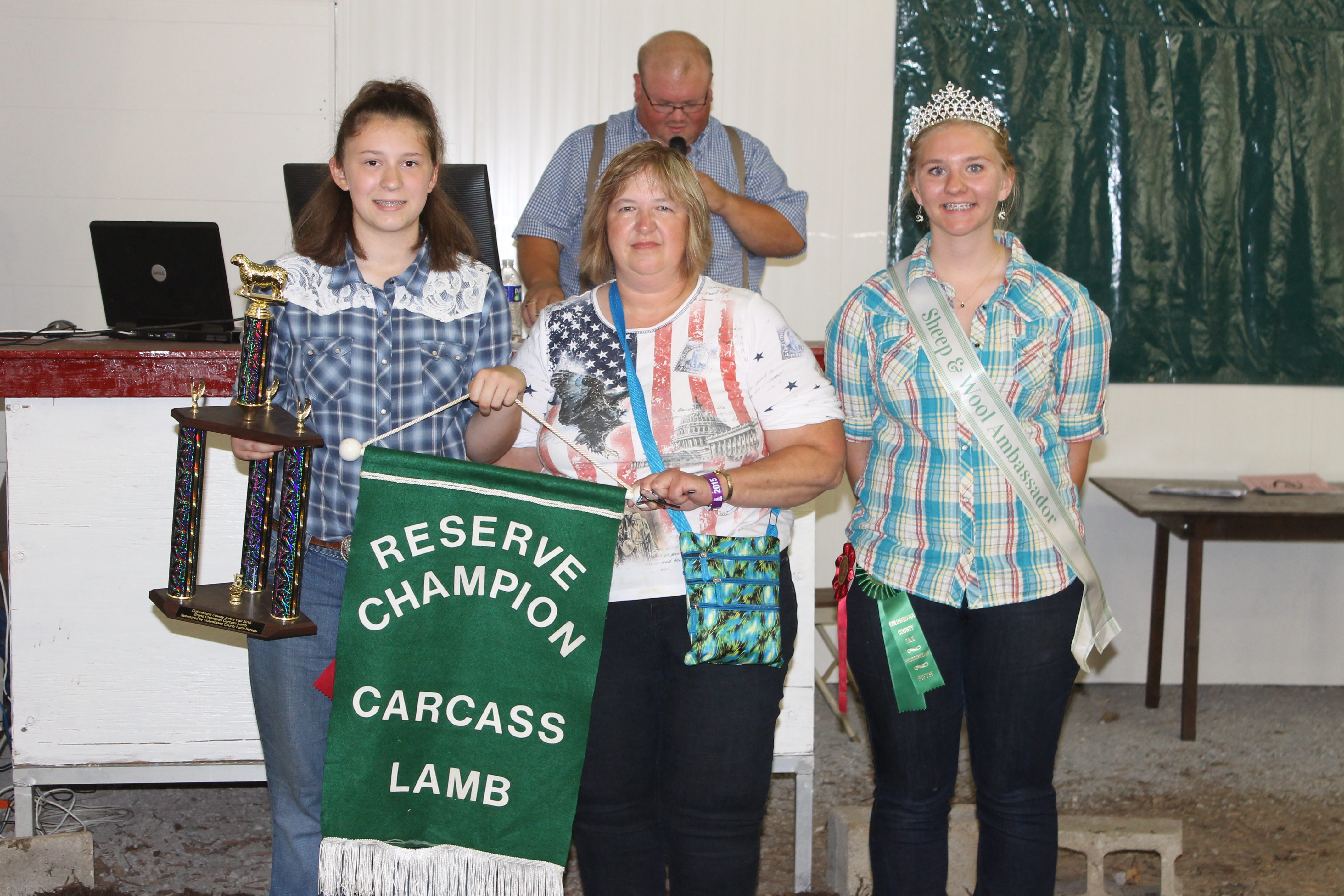 Brooke Fritz produced the reserve champion carcass lamb which garnered $2.25 a pound. The reserve champion carcass lamb was purchased by Birkhimer Sheep Farm. Pictured is Colette Birkhimer.