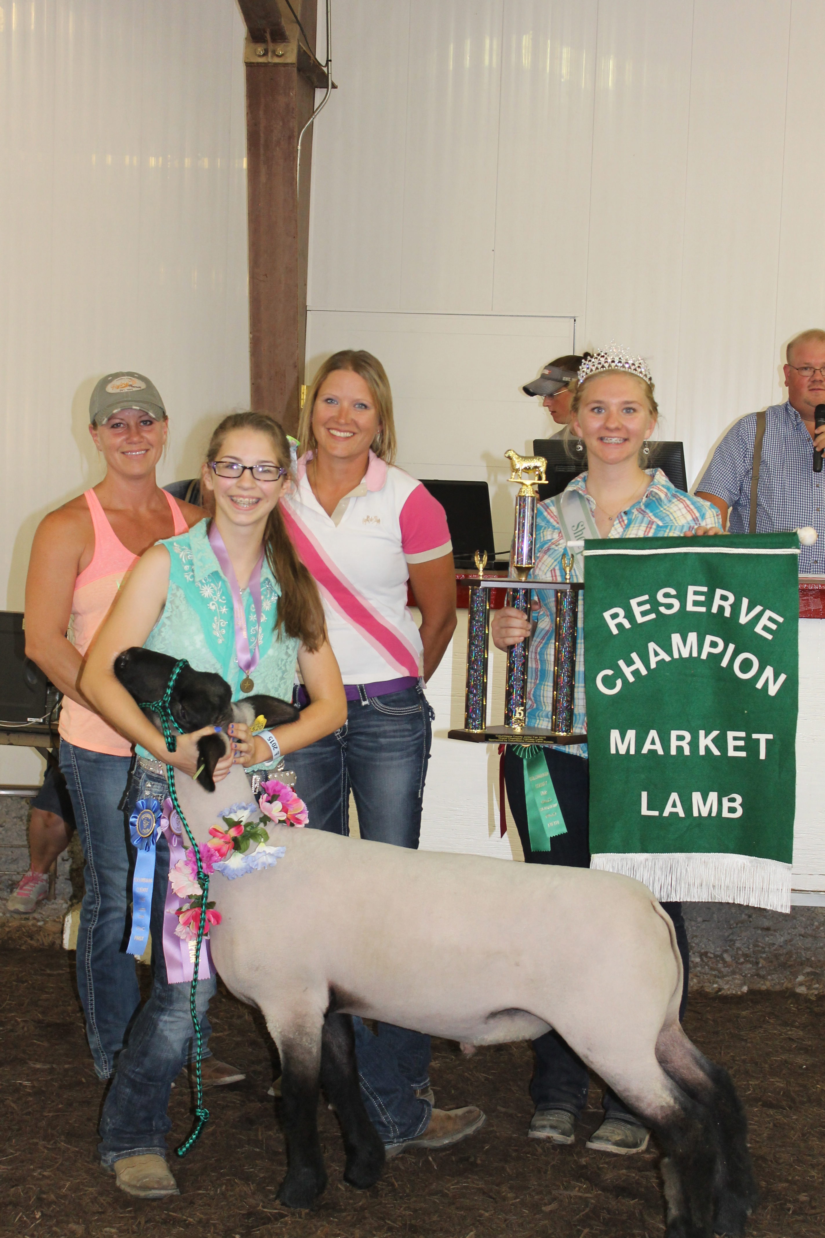 Margaret McNicol raised this year’s reserve champion market lamb which sold for $6 a pound to Pure Gold Stables. Pictured is Sara Campbell and Candace Hill representing Pure Gold Stables and 2015 Columbiana County Sheep and Wool Ambassador Becca Bock.