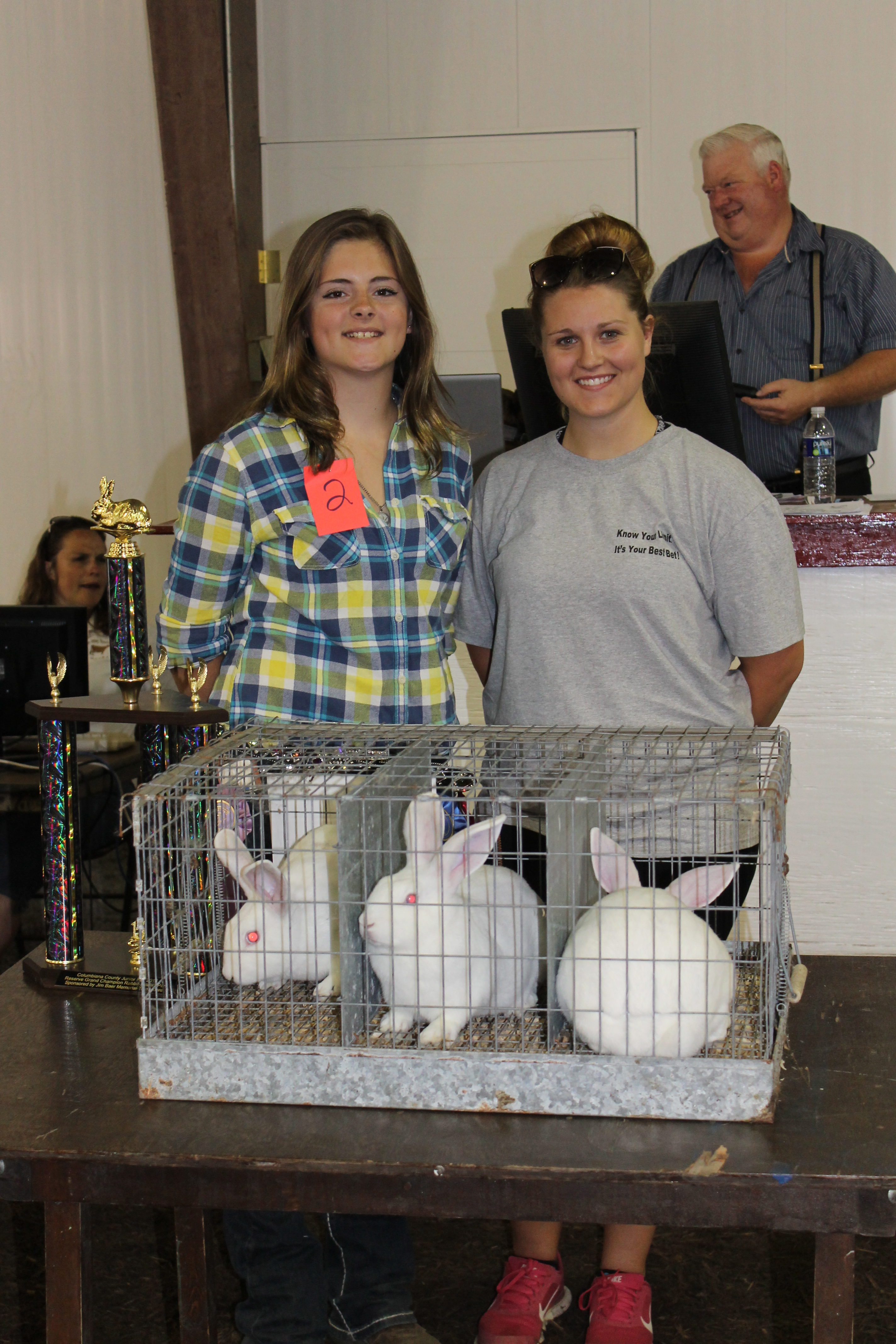 The grand champion pen of market fryer rabbits weighing 4.72 pounds was raised by Kylie Youst. The pen of rabbits sold for $125 to A Feel for Life Massotherapy. Pictured is Amanda Moore McKenzie and her niece, Peyton Muirhead.