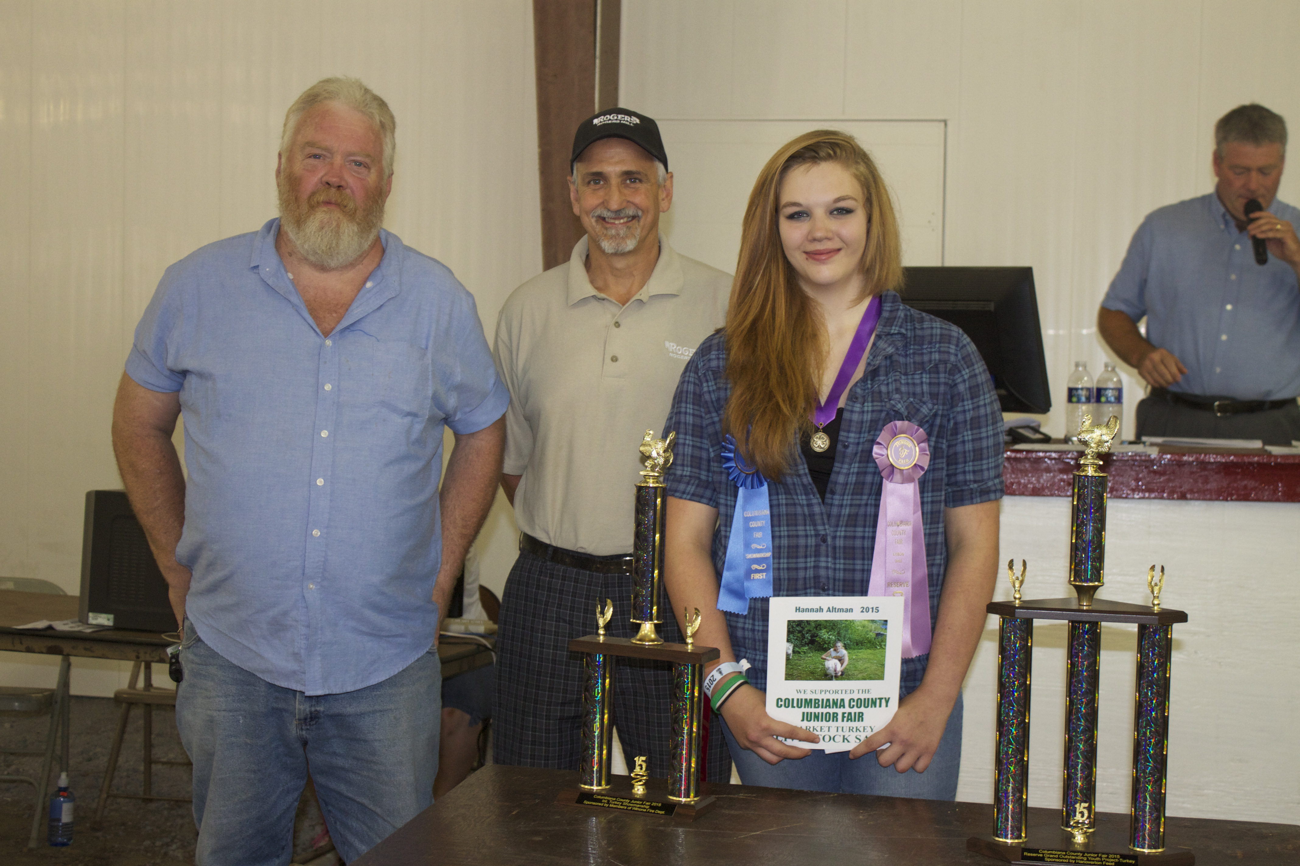 The reserve champion turkey was raised by Hannah Altman which was purchased for $200. She also brought home the title of reserve outstanidng turkey rpoject. The bird was purchased by Bob Black and Family and Roger’s Mill. Representing the mill was Tom Sutton and Keith Hebron.