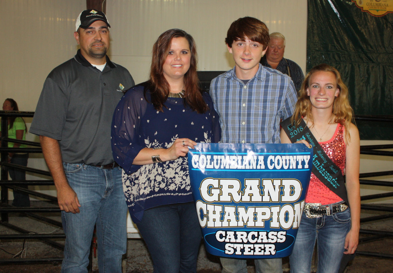 Mitchell Sharp’s grand champion carcass steer, weighing 1,355 pounds, sold for $4.25 a pound to Orange Leaf Frozen Yogurt, represented by Abbey Bacconi and Bryan Boyle. Also pictured is Beef Ambassador Betty Richey.