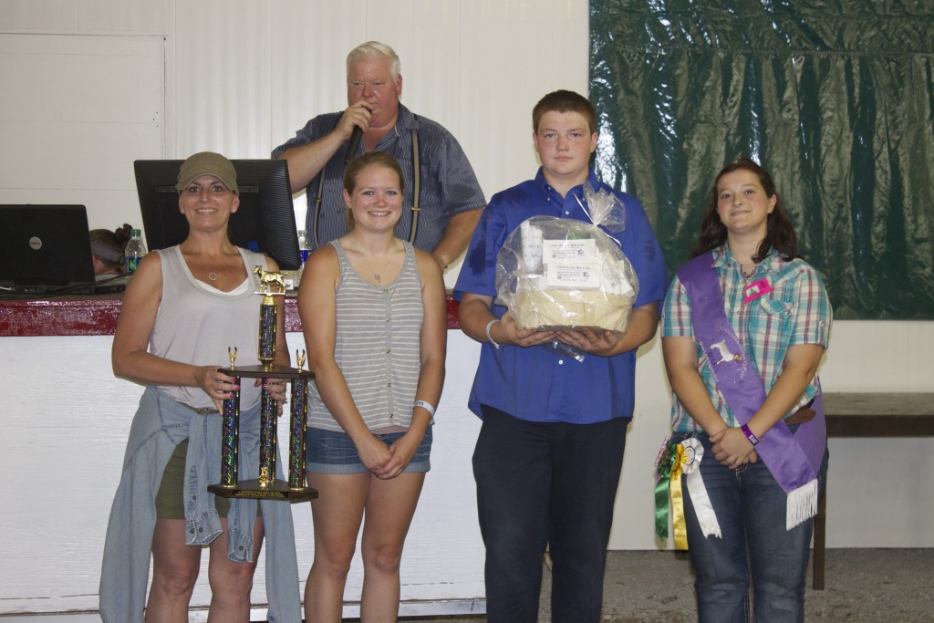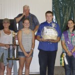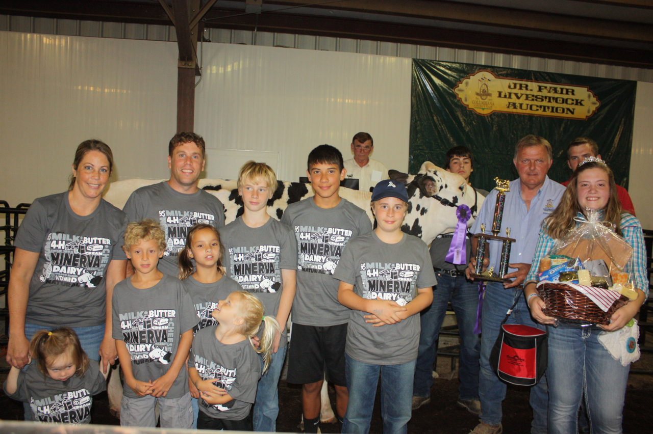 Salem Chrysler Jeep Dodge and Columbiana Chrysler Jeep Dodge, represented by Paul Lease (holding trophy), paid $2,100 for Cody Cooper’s grand champion cheese basket. Also pictured is Columbiana County Dairy Princess Courtney Cooper, and a crew from Minerva Dairy, which has calculated the cheese yields and donated the cheese for many years.