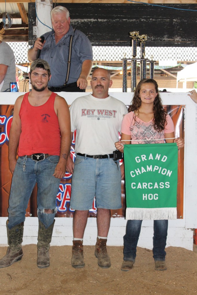 Macee Mercure raised this year’s grand champion carcass hog which weighed 267 pounds and sold for $6.50 a pound to Row Services, LLC. and RL Landscape Group, Inc. Pictured is Spender Rohr and Dan Rohr representing the businesses.