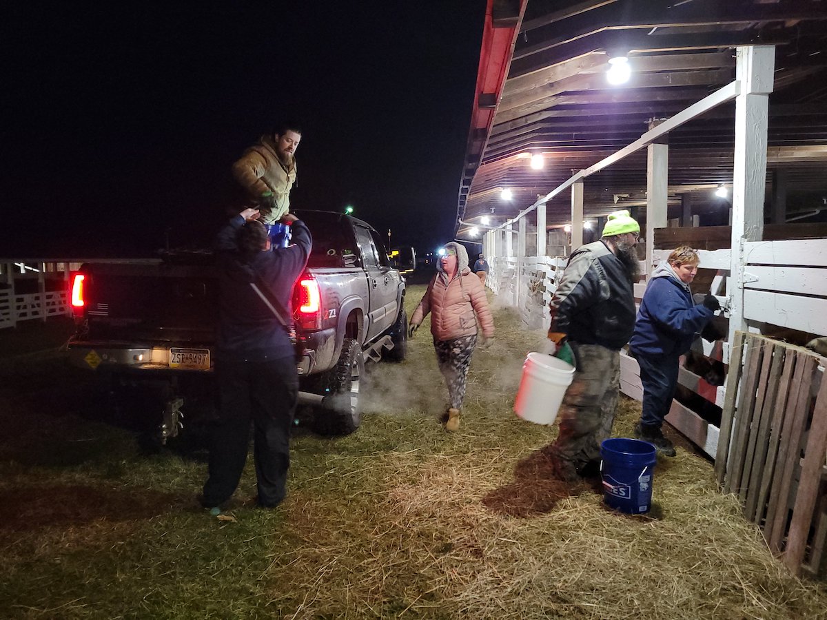 Steve and Amy Daley, of Aliquippa, Pennsylvania, saw Sopko’s post and called their babysitter. They have a pet pot-bellied pig that lives in their house, along with a variety of other small pets, but otherwise have no livestock experience. The couple just wanted to help. So there they were, on a freezing Monday night, pitching hay and carrying 5-gallon buckets of water.