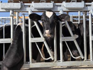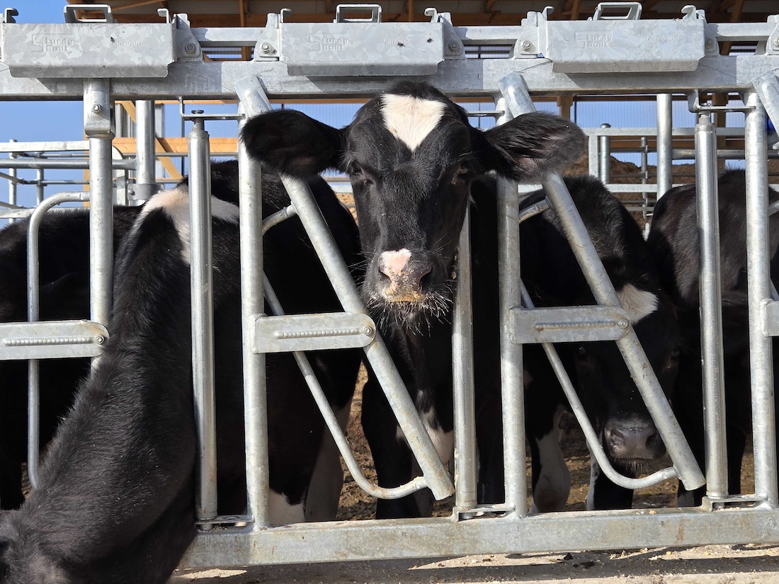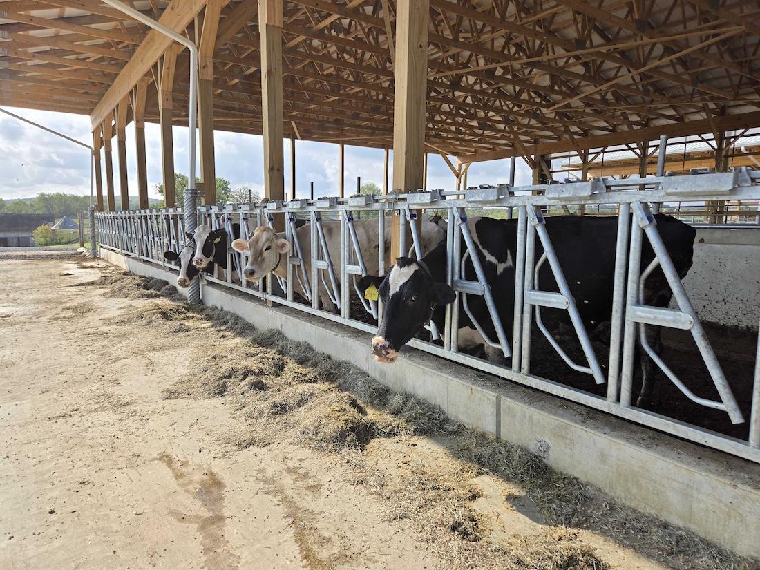 Now they can drop feed directly from the TMR mixer. The cows loaf comfortably in the modern, breezy free-stall heavy-use areas. There’s one building for young stock and one for cows. With the new manure storage pits, R