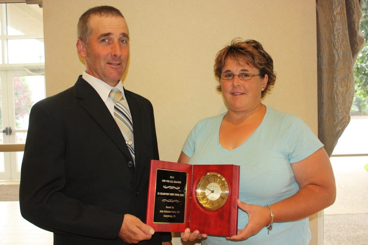 And Ohio Swiss breeders Ron and Renee Michalovich, of Lakeville, are raising some of the breed’s top producers. They received individual cow awards for the highest 305-day milk and fat production, on at 305-day test, milking twice a day. Their 4-year-old cow, RNR Supreme Janna, produced 42,410 pounds of milk; 2,870 pounds of fat at 6.8 percent; and 1,361 pounds protein, at 3.2 percent.