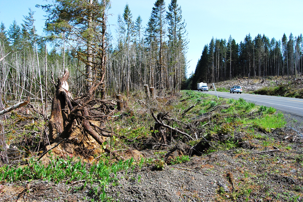 If a large tree has lots of space to grow roots in only one direction and the winds come from the other direction, there is a strong potential for the tree to blow over.