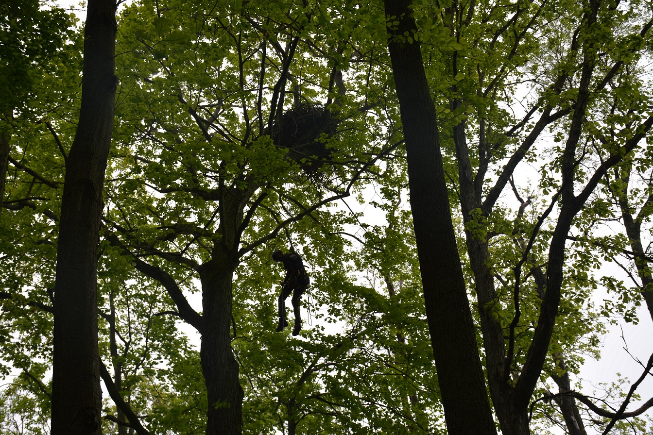 Biologist Tim Hoppe and habitat management worker Mark Kahrer have returned displaced eaglets to nests in the past and were called upon once again.