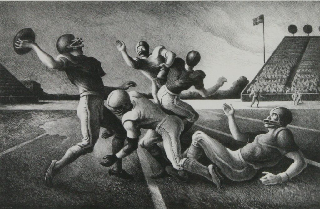 “It is amazing to see how artists have been responding to football and interpreting its prominent role in American life since the 19th century,” said Danielle Knapp, who co-curated the exhibit for the Jordan Schnitzer Museum of Art at the University of Oregon, which organized the exhibition with the Gregory Allican Museum of Art at Colorado State University.