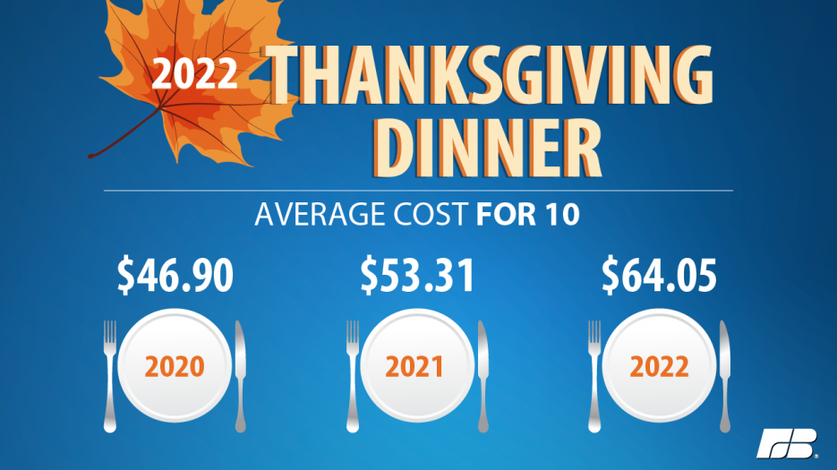 WASHINGTON — Spending time with family and friends at Thanksgiving remains important for many Americans and this year the cost of the meal is also top of mind. Farm Bureau’s 37th annual survey provides a snapshot of the average cost of this year’s classic Thanksgiving feast for 10, which is $64.05 or less than $6.50 per person. This is a $10.74 or 20% increase from last year’s average of $53.31.
