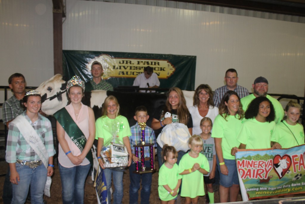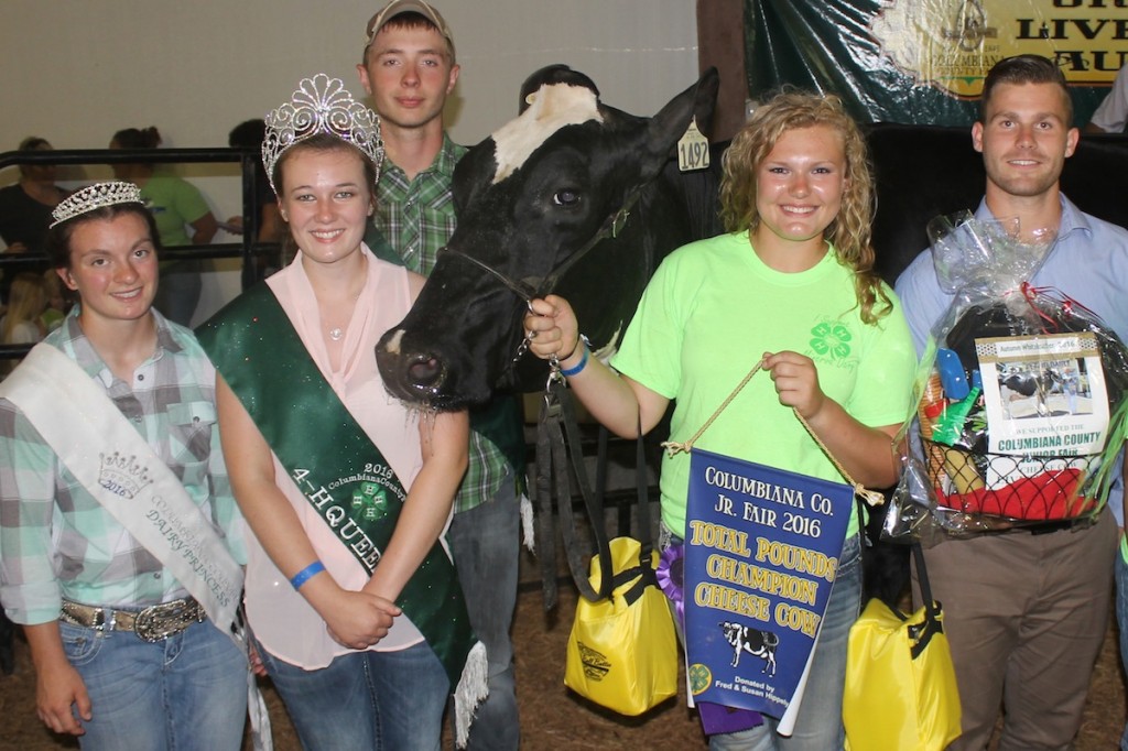 Autumn Whiteleather entered the champion cheese cow, total pounds. Paris & Washington Insurance, represented by Hunter Palmer, paid $4,500 for the cheese basket. Also pictured are representatives of Minerva Dairy.