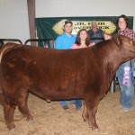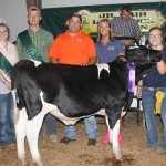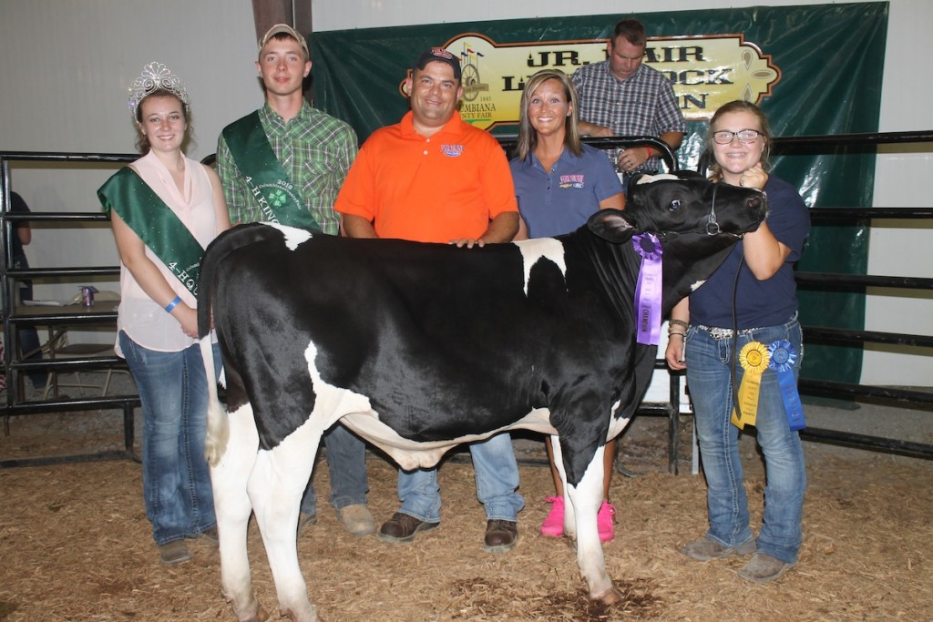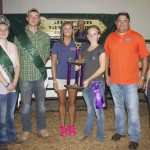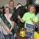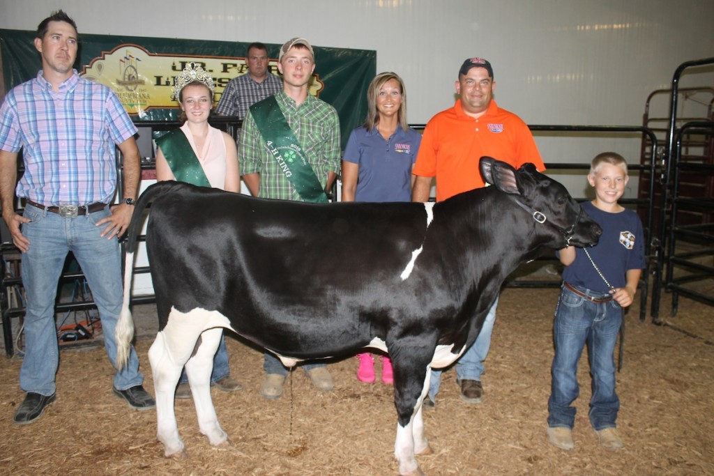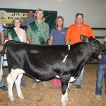 Kirstin Smith’s 615-pound grand champion dairy beef feeder sold for $3 a pound to Sarchione Auto Sales, represented by Joe Sarchione and Amanda Metts. Also pictured are the fair royalty, Vaughn Unger and Brandon Veiock.