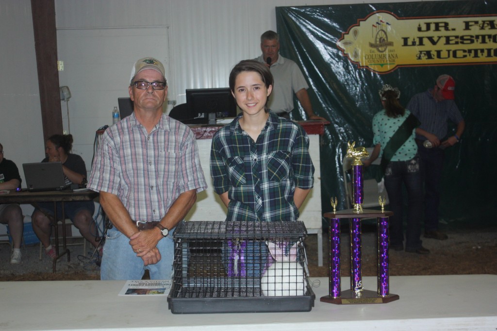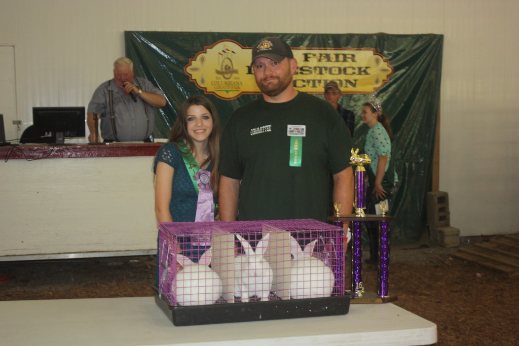 The Columbiana County grand champion pen of market rabbits was raised by Kylie Youst. The pen, weighing 14.40 pounds, sold for $95 per head to Hilltop Lawn and Garden, represented by Heather Baker.