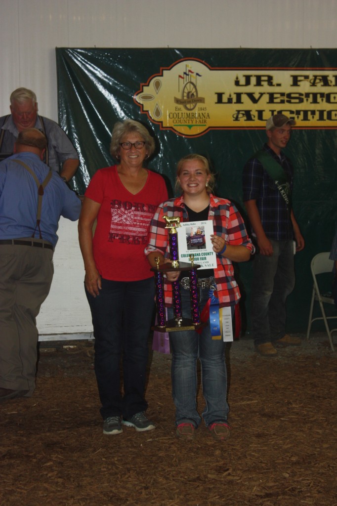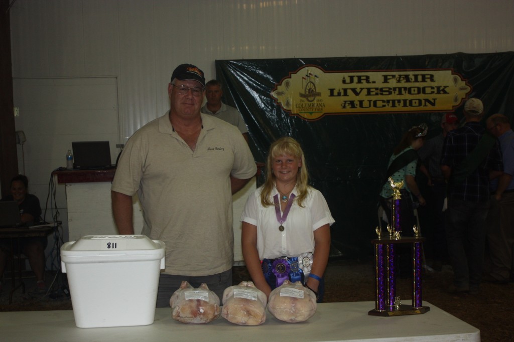 Calee Lukowski exhibited the Columbiana County Fair grand champion market poultry carcass. With a carcass weight of 30.80 pounds, the pen sold for $225 per head to Case Farms, represented by Chuck Sluss.