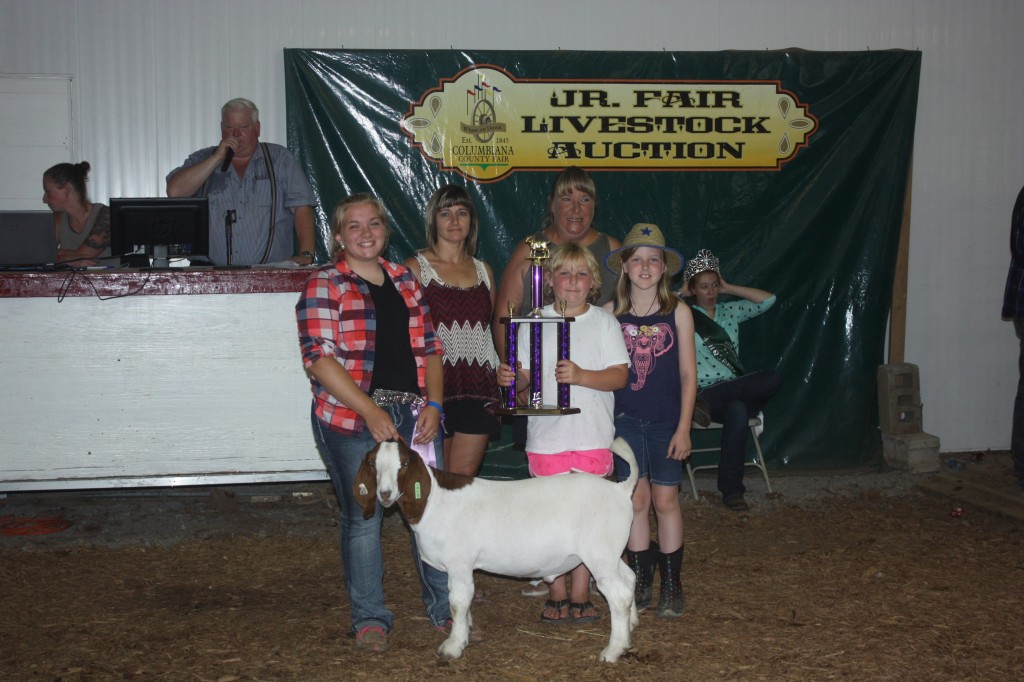 The 2016 Columbiana County Fair grand champion market goat was shown by Emmy Jones. The goat, weighing 112 pounds, sold for $4 per pound to Patrick Souders, representing D & G Mechanical.