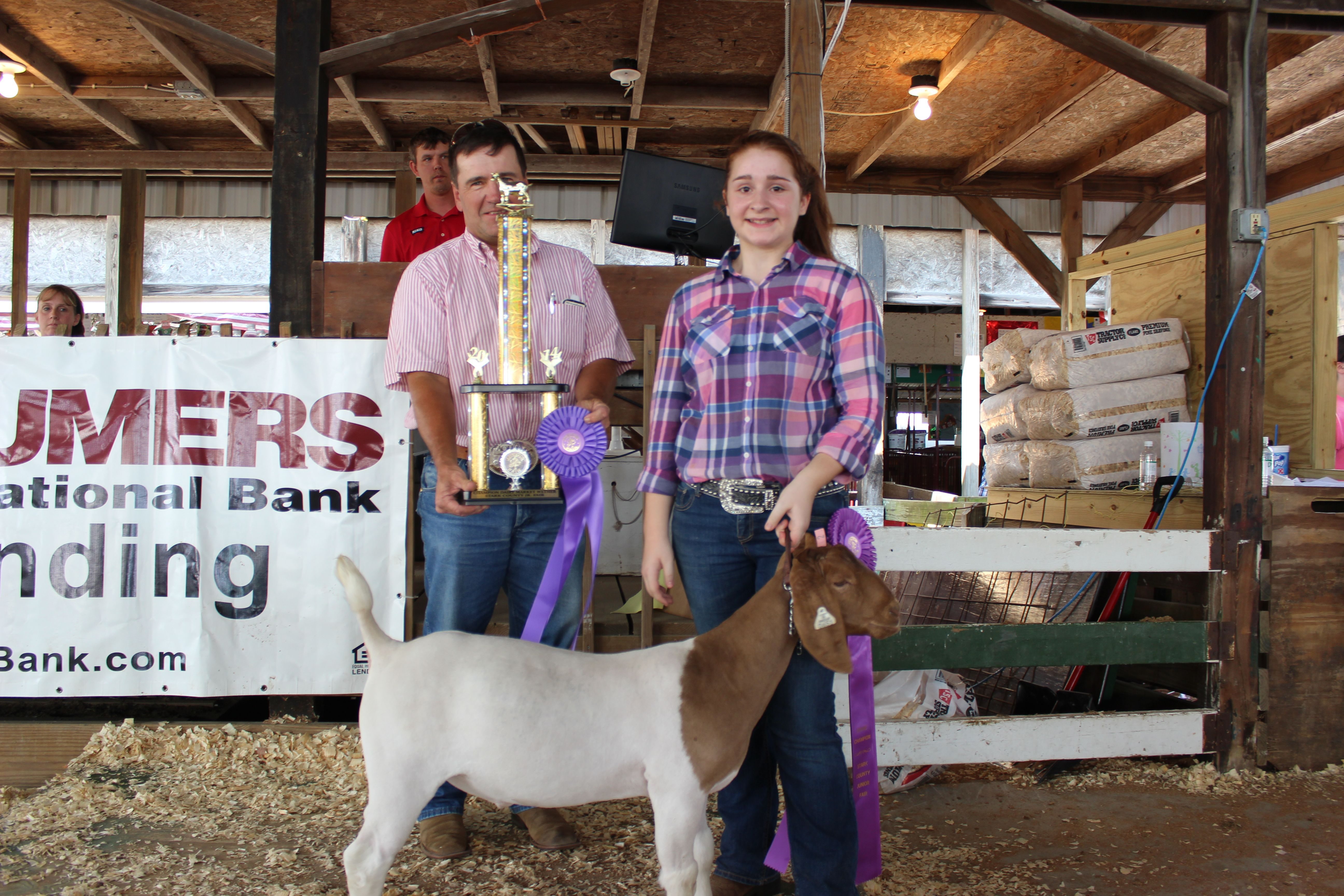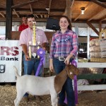 Farmers Exchange bought Samantha Starcher’s 85-pound grand champion dairy market wether for $6 a pound. Pictured with Samantha Starcher is Brian Cairns and Jill Sterling of Farmers Exchange.