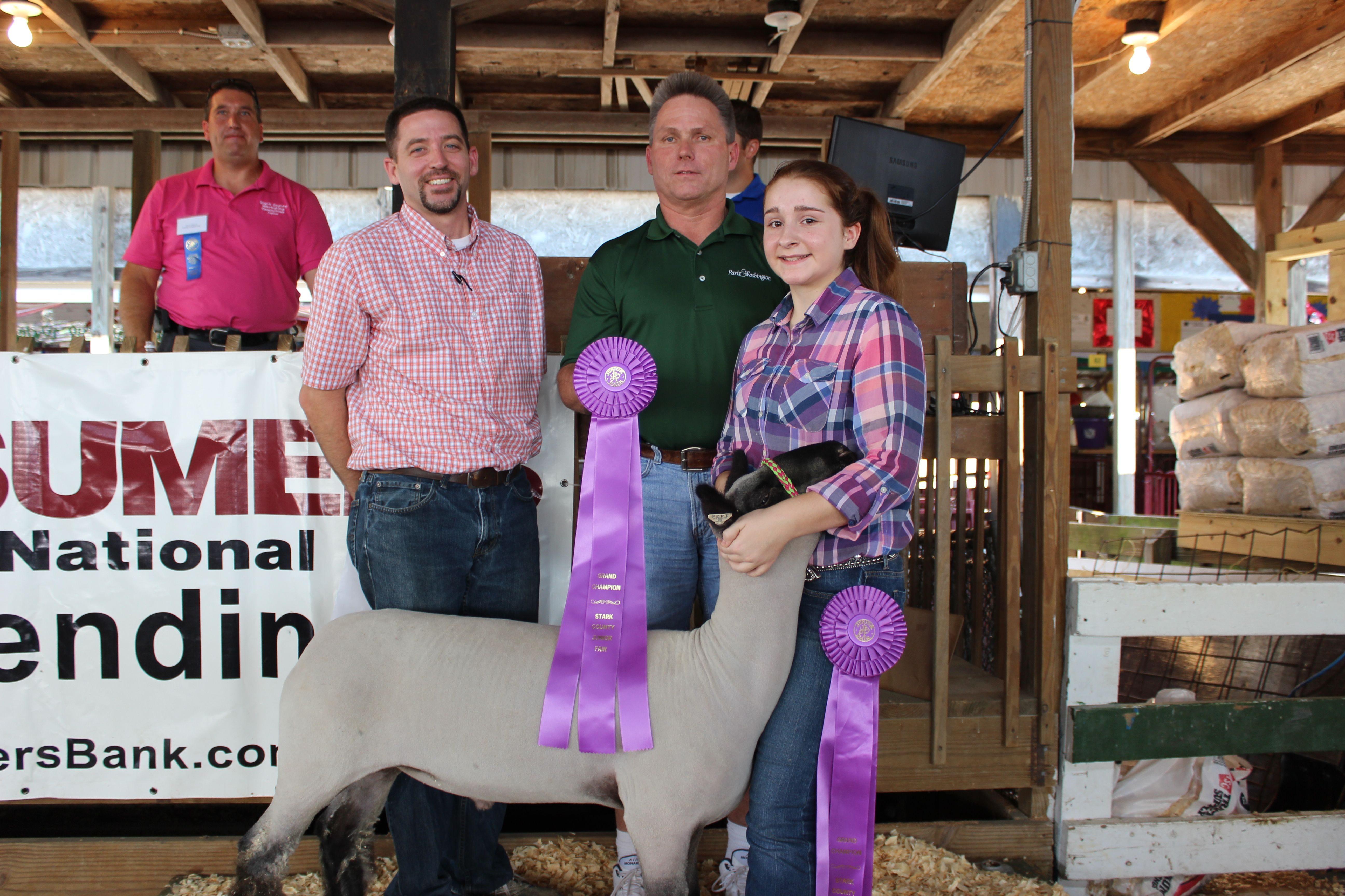 Natalie Frank’s 138-pound grand champion lamb sold to Paris and Washington Insurance and Pole Barns Direct LLC, Dutchcraft Truss & Metal Inc. for $22 a pound. Pictured from left are Reggie Stoltzfus of Dutchcraft Truss & Metal Inc/Pole Barns Direct, Kelly Palmer of Paris and Washington Insurance, and Natalie Frank.