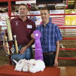 Christian Pernell sold his pen of grand champion rabbits to Rohn Ranch Trailer sales for $350. Pictured with Christian Pernell is Earl Rohn.