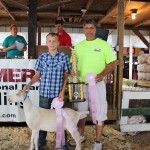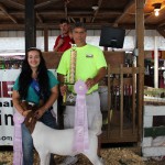 Natalie Frank’s 82-pound grand champion market wether received a bid of $21 a pound from Hamilton Ins. Agency, Kemp Insurance Agency, and Sugarcreek Construction Co. Pictured with Natalie Frank is Ed Rohr of Sugercreek Construction.