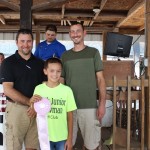 Logan Skolosh received a $6 a pound bid from Bishop Construction, Inc. for his 580-pound reserve champion dairy feeder. Pictured from left are Mark Skolosh, Mark Bishop, and Logan Skolosh.