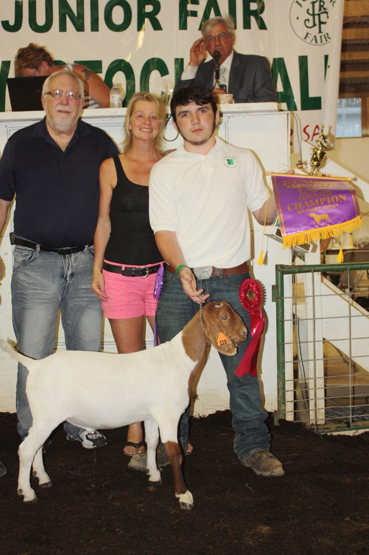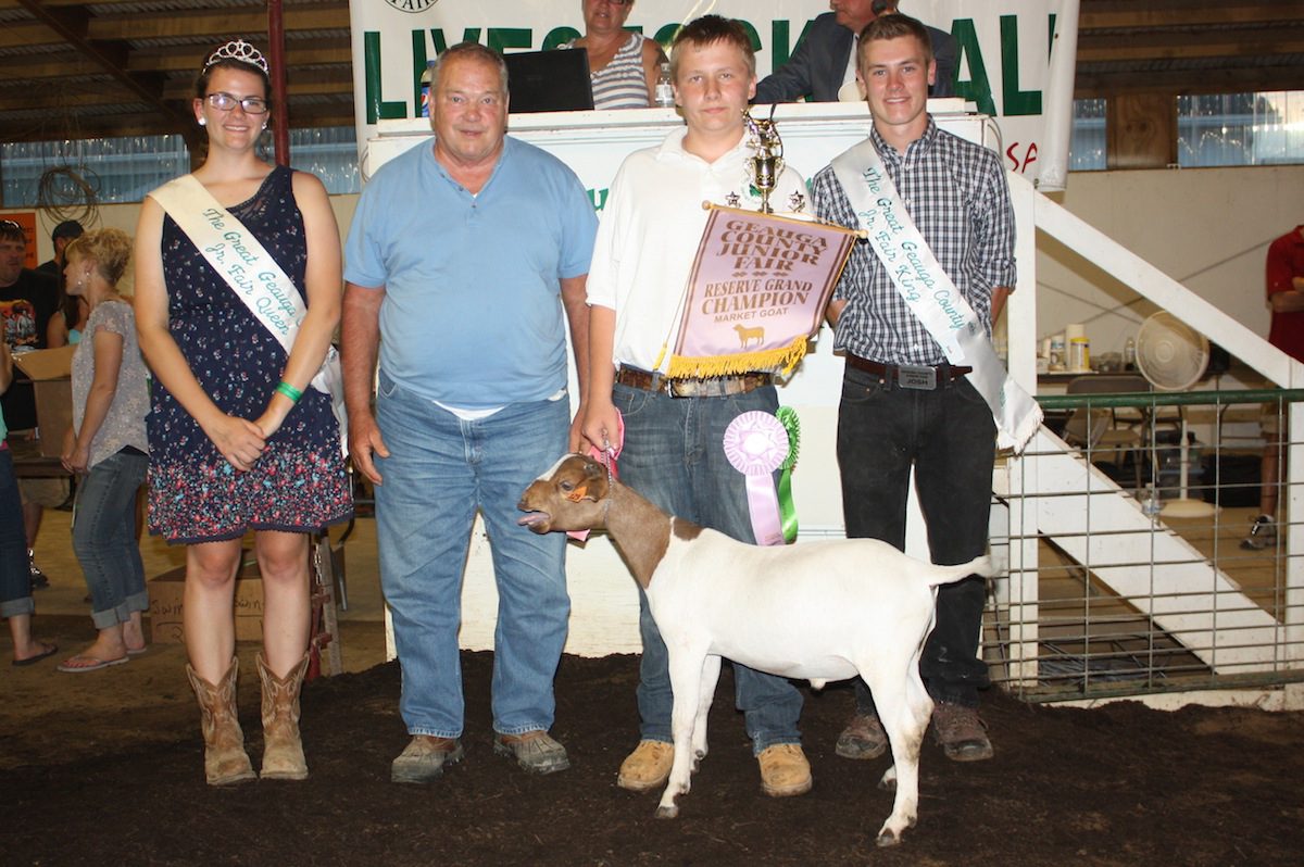 Devon Kitko’s 66-pound grand champion goat sold for $22 a pound to Green Family Funeral Home, represented by Nancy Caldwell and Dave Green.