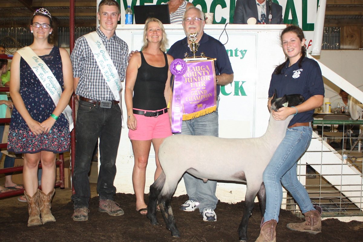 Cailee Rendlesham’s 136-pound grand champion lamb sold for $7 a pound to Green Family Funeral Home, represented by Nancy Caldwell and Dave Green.