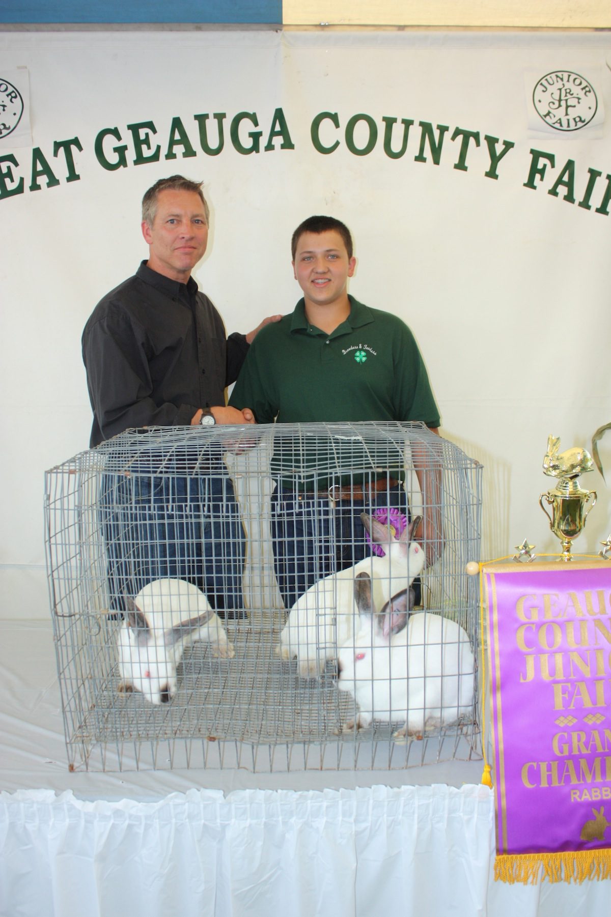 Ryan Ivans sold his grand champion pen of rabbits weighing 13.20 pounds to John Bruening of Geauga Vision for $85 a pound.