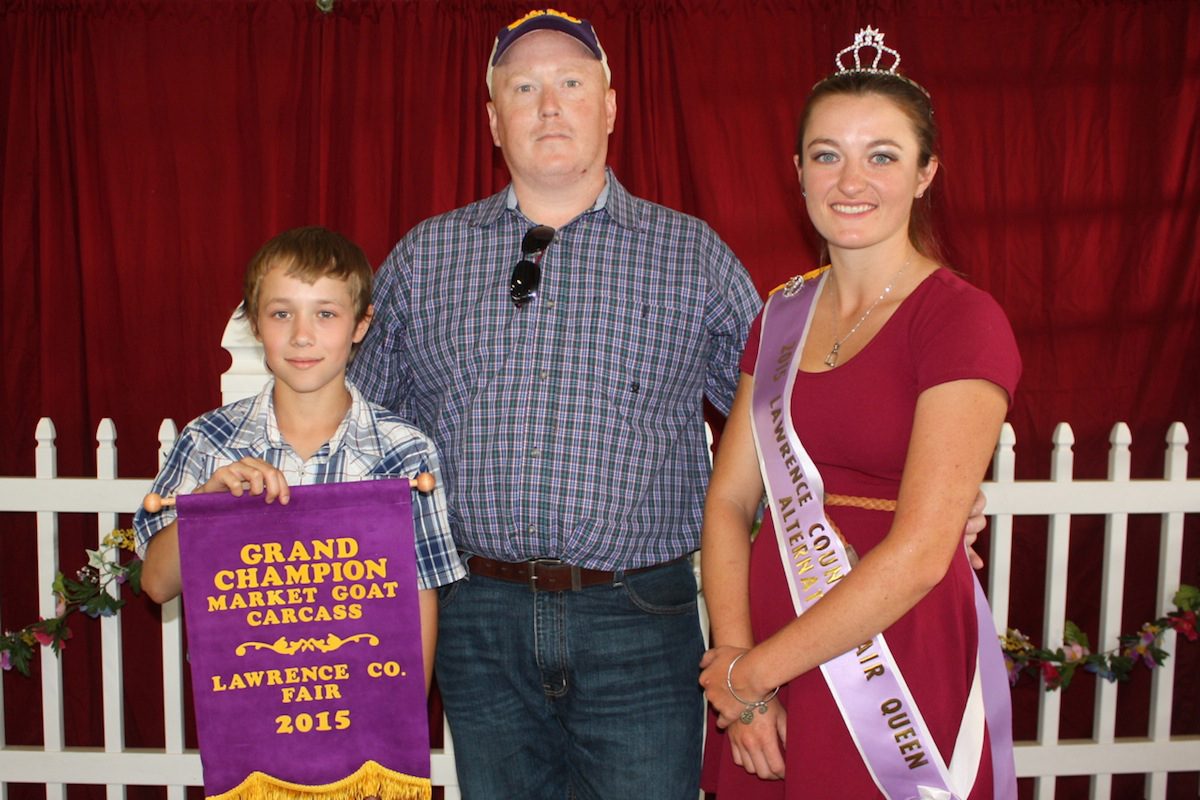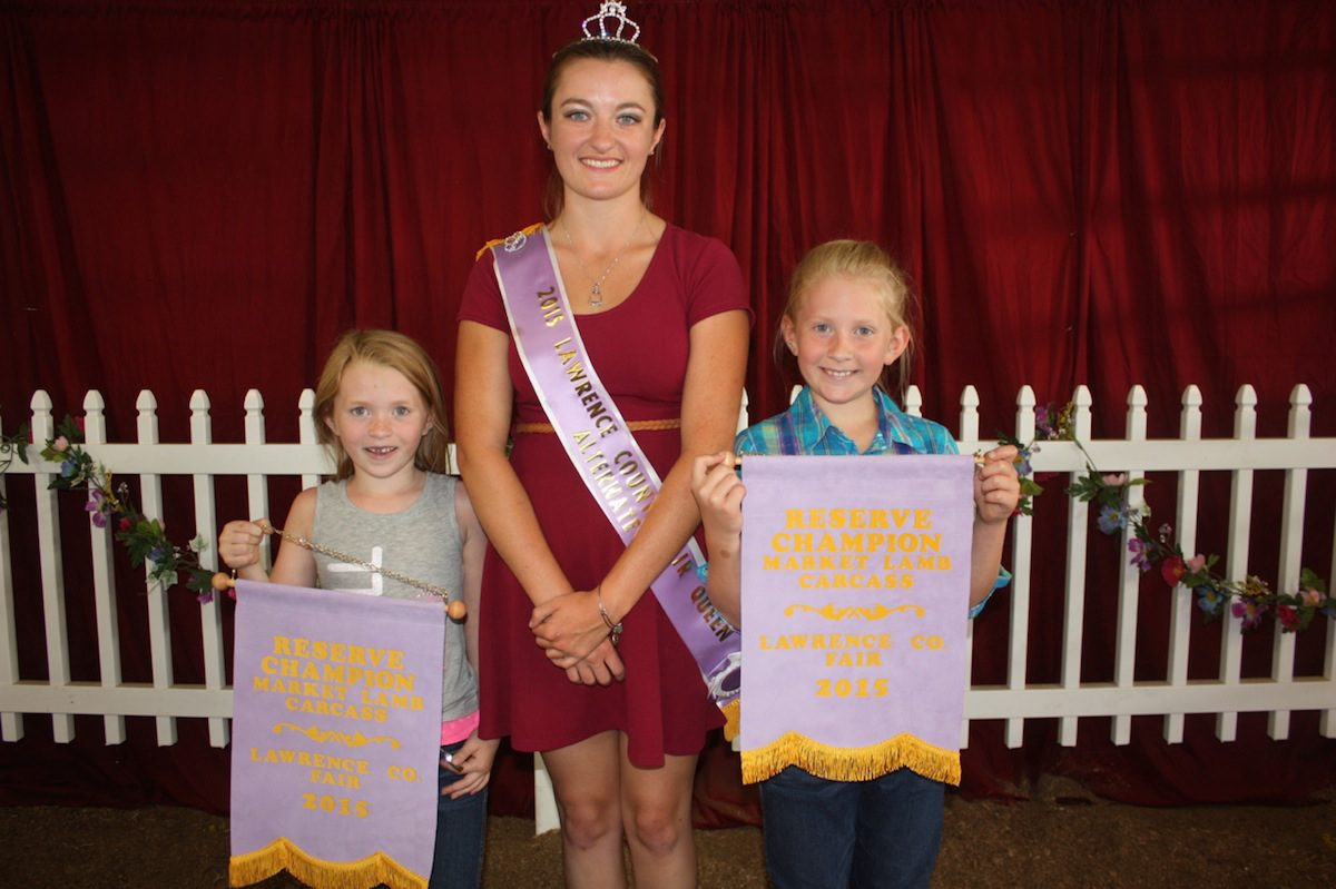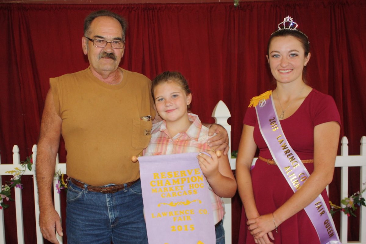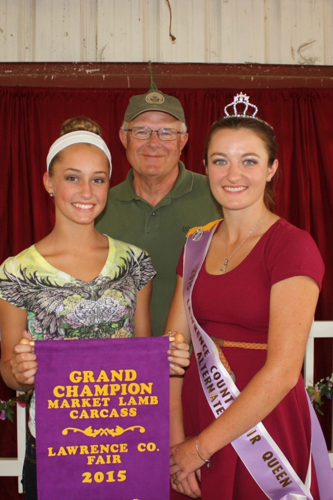 Emily Gibson’s 80-pound grand champion lamb carcass sold for $9 a pound to Don (pictured) and Edy Hoye. Also pictured is alternate fair queen Sarah Smith.