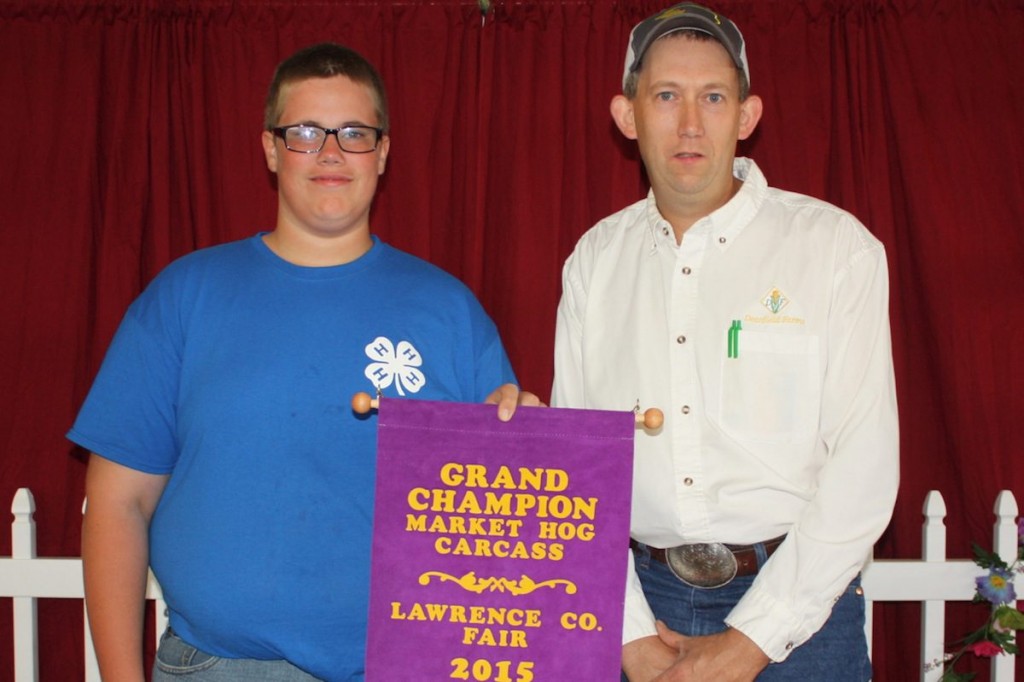 Dakota Stoner’s 184-pound grand champion market hog carcass sold for $4.25 a pound to Deerfield Farms Service, represented by Matt Fenton.