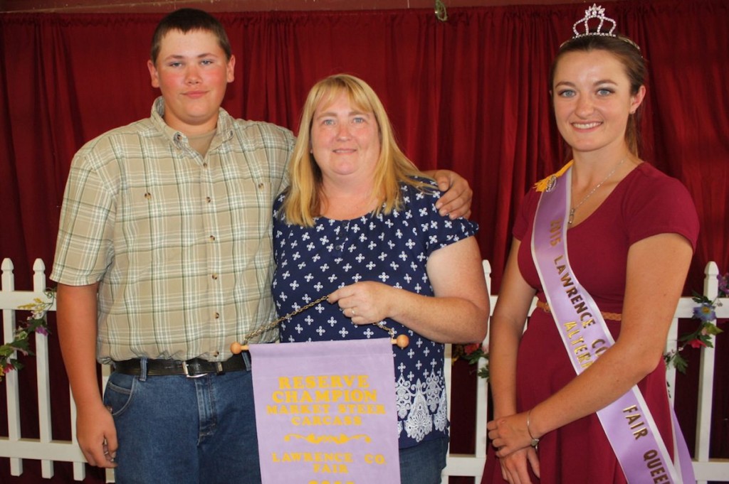 Wyatt Dean sold his 1,332-pound reserve champion steer to Howard & Son Meat Packing, DJ’s Smokehouse and Howard Law Firm, represented by Nicole Howard. Also pictured is alternate fair queen Sarah Smith.