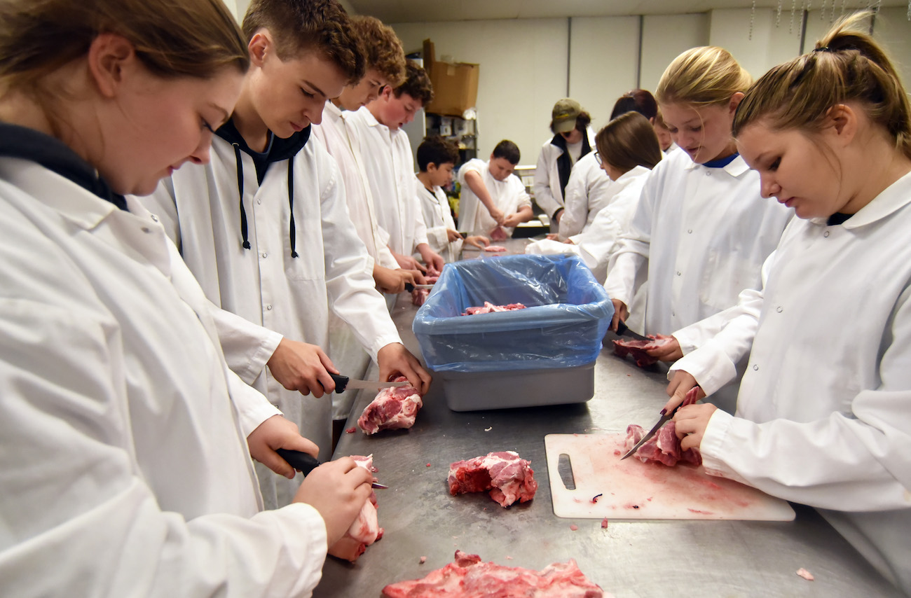 The district built a meat lab, complete with two walk-in coolers and a walk-in freezer, in 2005 for the animal processing classes and the FFA’s ham and bacon program.