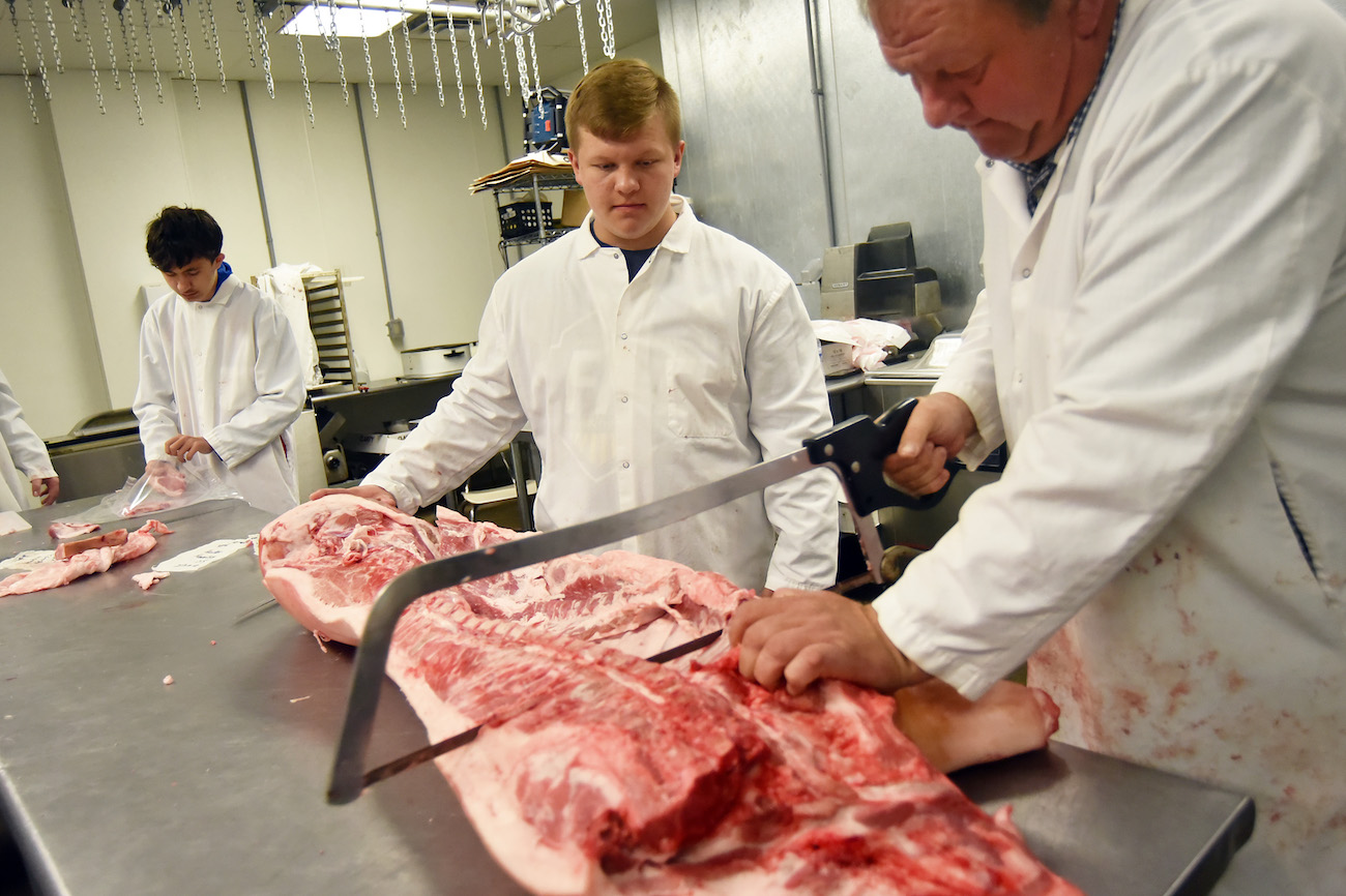 This year 35 Tyler students raised 73 hogs that will be processed at the school’s meat lab into hams, bacon, pork chops and sausage. The hams and bacon are auctioned off at a sale in March, with proceeds going back to the students.
