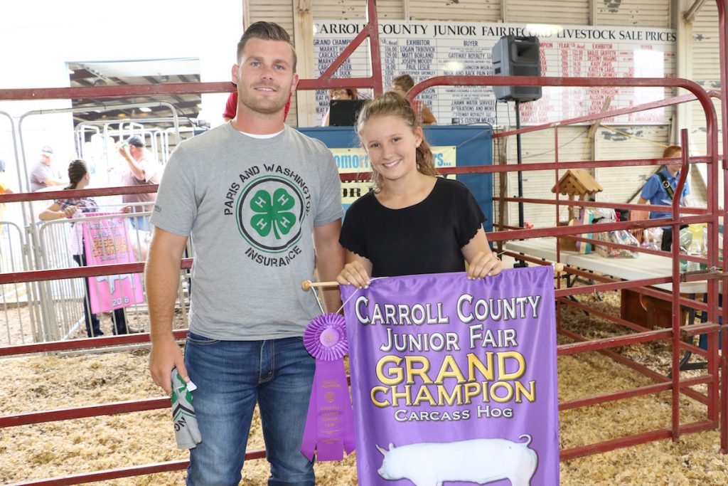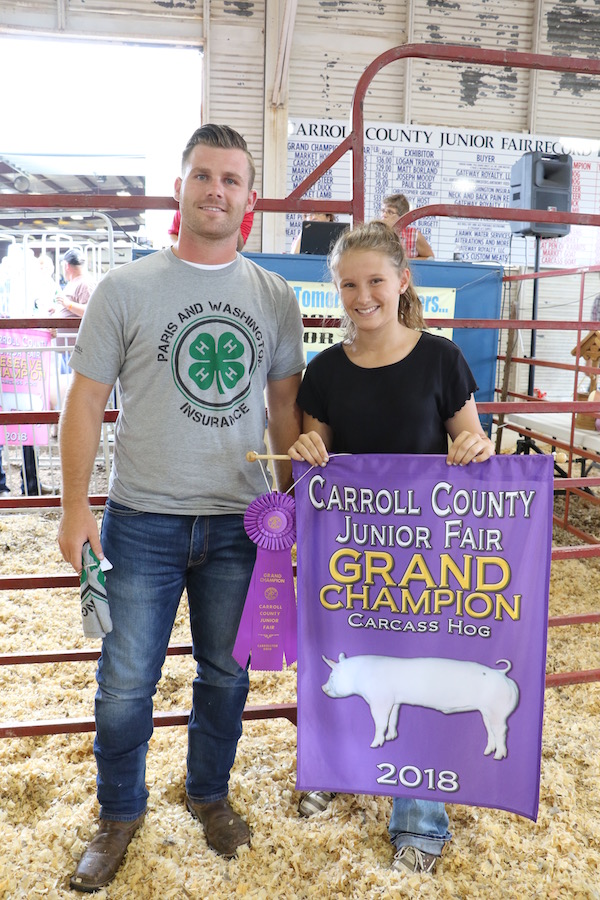 Jadyn Pidgeon raised the grand champion carcass hog, with a hanging weight of 162 pounds. It sold for $12 a pound to Paris-Washington Insurance, represented by Hunter Palmer.