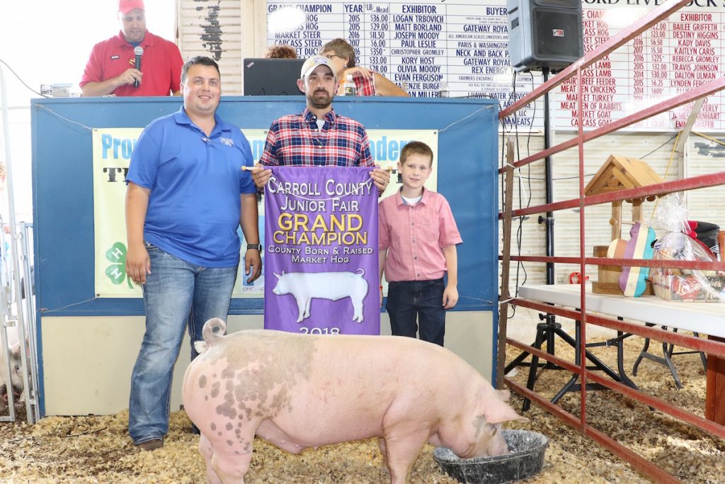 The grand champion Carroll County born and raised market hog, raised by Collin Eckard, sold for $5 a pound to Sarchione Ford in Waynesburg, represented by Kurt Stanley and Dustin King.