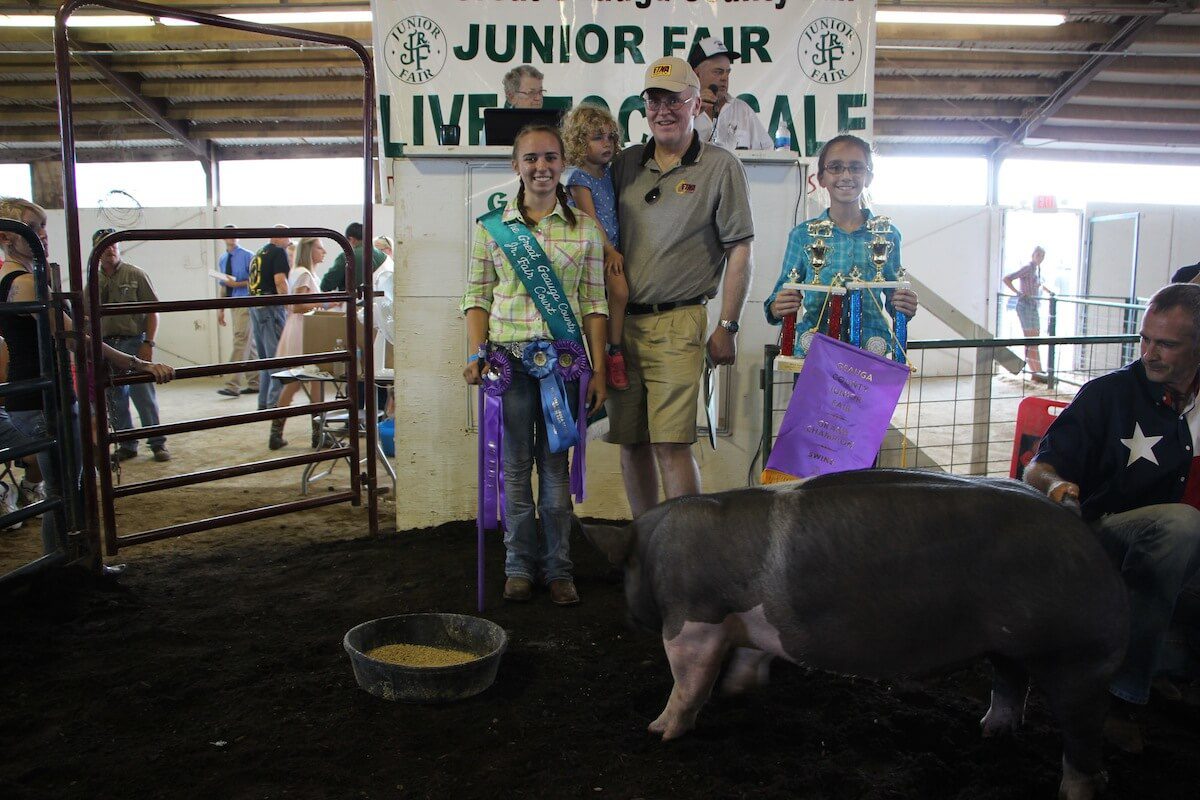 Brianna Patrick sold her 281-pound grand champion market hog for $20 a pound to Etna Products Inc., represented by Ike Tripp and Maryanne Golden. Paige Patrick joined them.