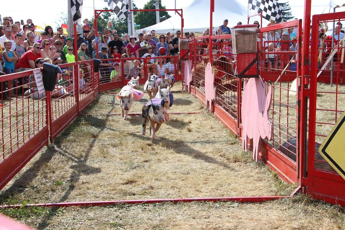 Spectators filled the stands to watch the pig races Sept. 5, a popular event at the Geauga County Fair. Lindsay “Lo-ham” took the lead as the male and female teams raced around the track. (Catie Noyes photo)