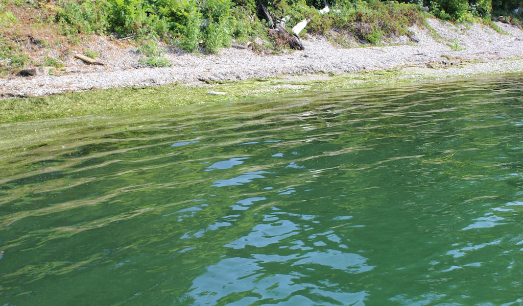 Harmful algal bloom as seen from the research docks of The Ohio State University’s Stone Laboratory on Gibraltar Island in Lake Erie in 2013. Image by Jeff Reutter, courtesy of Stone Laboratory.