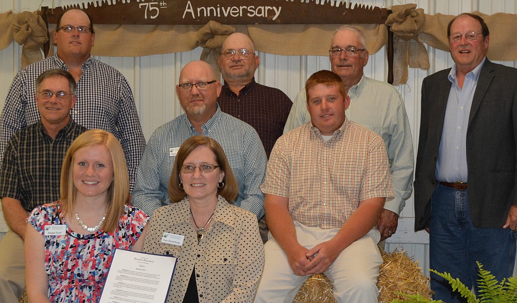 Ohio Director of Agriculture Dave Daniels (standing, far right) presented a special 75th anniversary proclamation to the Highland SWCD on behalf of Ohio Gov. John Kasich. Also pictured during the April 18 event are: (seated, L-R) Megan Scott, district resource specialist, and Pam Bushelman, district operations manager; (middle, L-R) Jeff Boike, supervisor; Chuck Williams, district technician; Kyle Mustard, supervisor; (back, L-R) supervisors Jim Carr, Dan Chambers and Larry Shannon.
