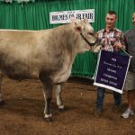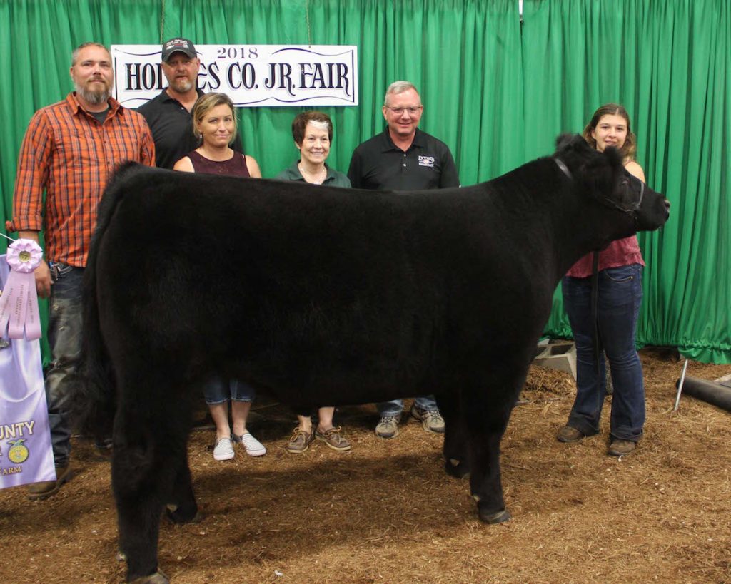 Natalie Schlegel’s 1,471 pound reserve champion dairy steer was purchased by Chuck Nicholson Auto Supercenter, represented by Barry and Lori Nicholson, for $1.75 per pound.