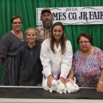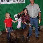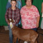 Hayden Smith’s 92-pound champion meat type market goat was purchased by Troy Hill Angus Farm, represented by Randall Troyer, Circle S. Goat Ranch, represented by Shane Troyer and Lance Troyer, Dublin Valley Angus Farm, and Rockin J Farm Tyler Smith, and Troy Hill Trucking for $15 per pound.