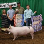 Hayden Smith’s 1,321-pound champion beef steer sold for $12.50 per pound to Bird Enterprises, represented by Tom and Cheryl Bird. Also pictured are Hunter Smith, Susie Hager, Rochelle Smith, Anicia Smith, Rob Smith and Mason Hager. The steer was also named as the champion Holmes County bred and raised steer.