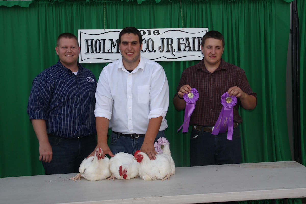 Gerber Poultry and Gerber Farm Division, represented by Josh Hanzie bid $1100 for Shane Troyer’s reserve champion pen of broilers. Also pictured is Lance Troyer.
