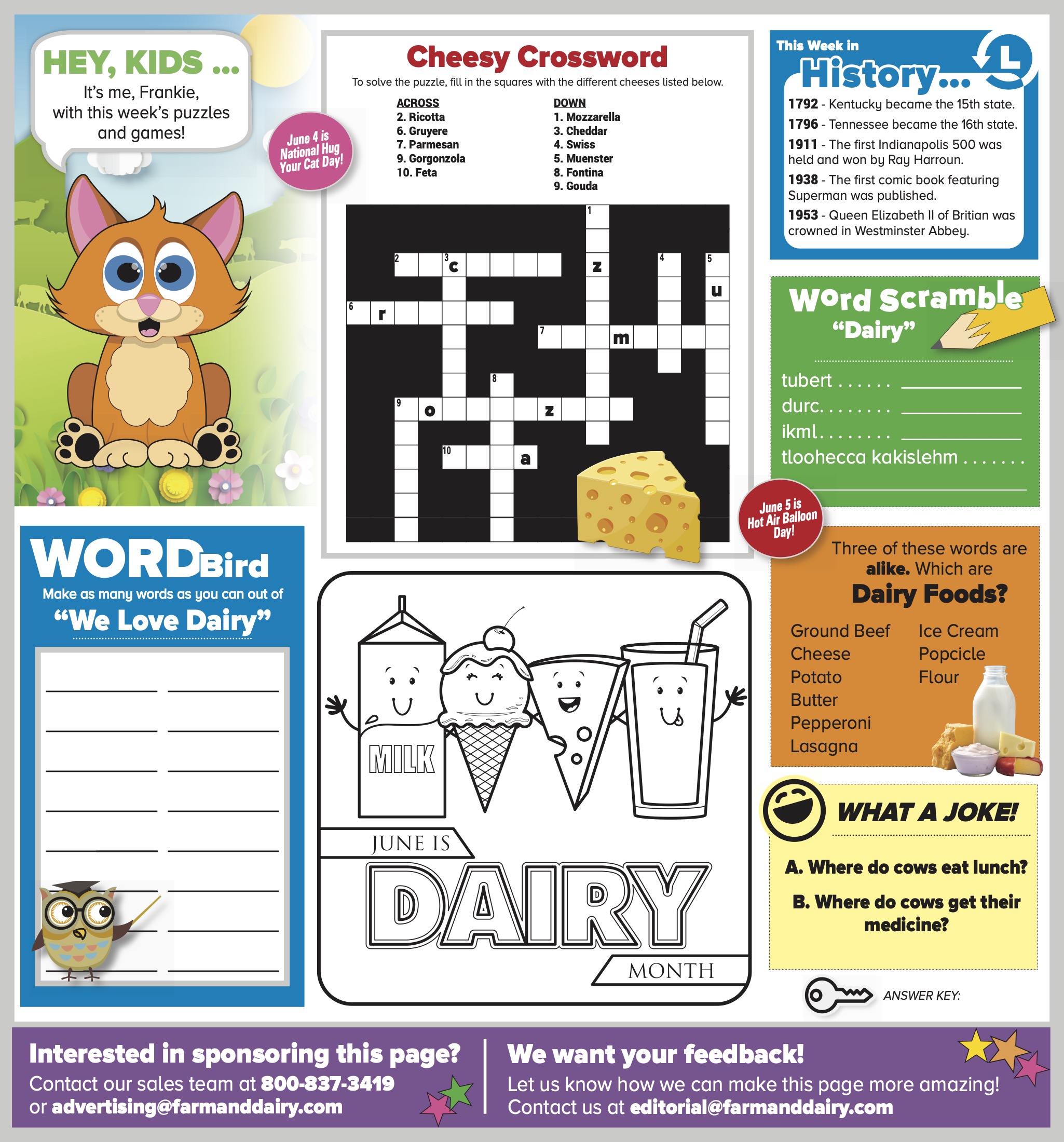 We’re sorry we forgot to put the Kids Page answer key in the May 30 Farm and Dairy! Thank you for your calls to alert us of the problem, and for your patience as we came up with a solution. You’ll find the answers to this week’s puzzles below.