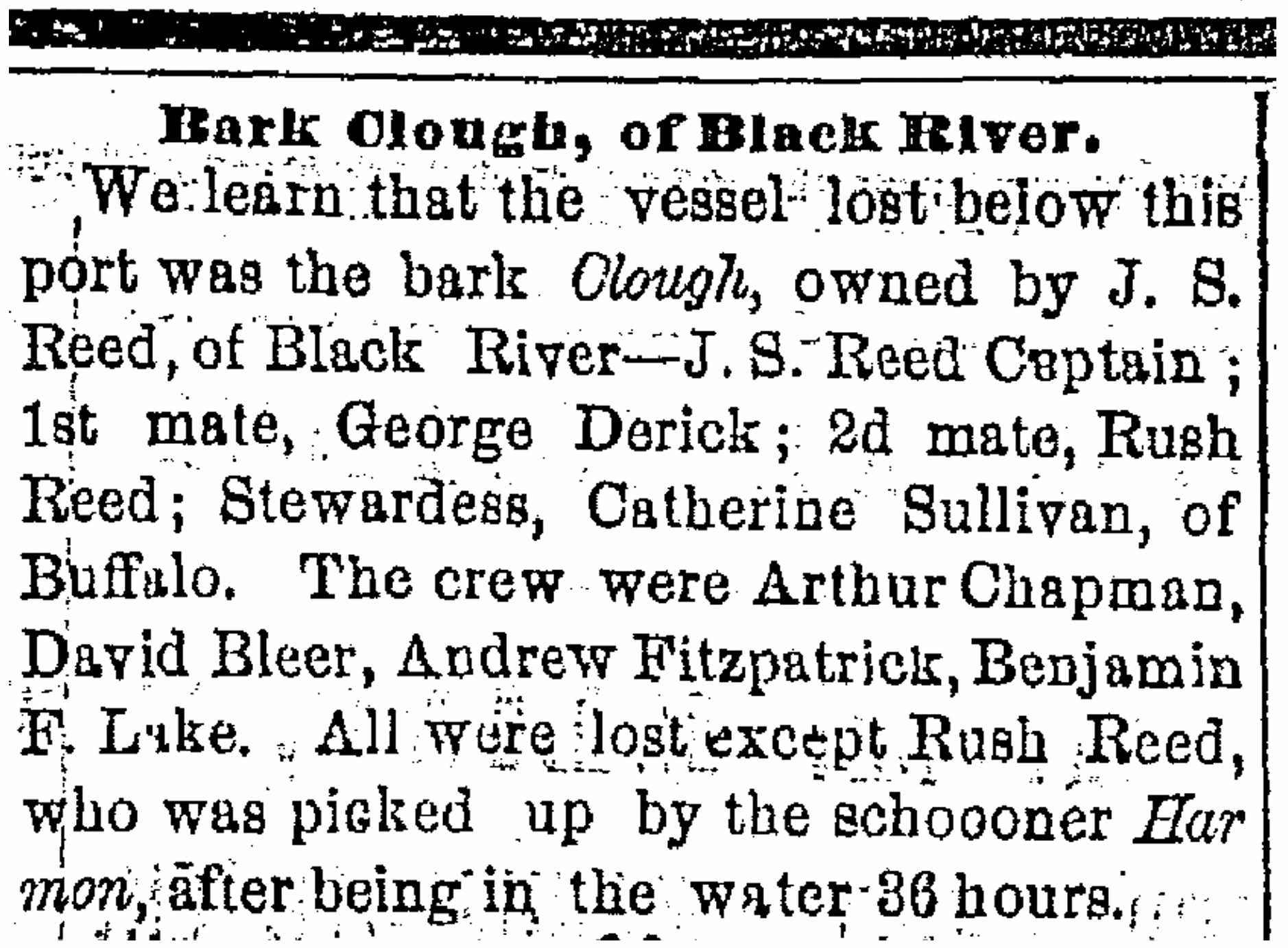 For about half an hour, her crew of nine, which included Captain J.S. Reed, 1st Mate George Derick, Stewardess Catherine Sullivan, Arthur Chapman, David Bleer, Andrew Fitzpatrick and Benjamin F. Leighton, fought to right the vessel, but she never recovered. The ship floundered before slipping beneath the waves, and all but one man were lost. According to a Sept. 17, 1868 article in The Plain Dealer, the survivor, Rush Reed — the captain’s brother who was serving as 1st mate — was in the water for 36 hours before he was rescued. Leighton’s body was later recovered, washed ashore in Euclid, Ohio, carrying a gold watch with his name engraved on it.
