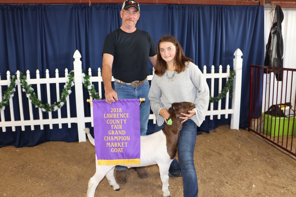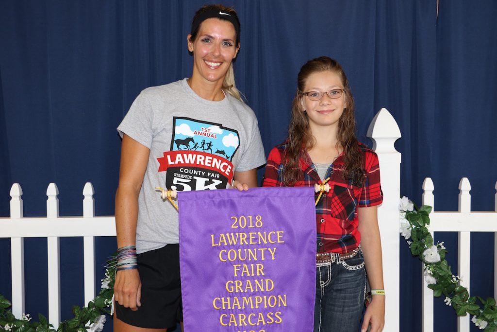 Alexis Hufnagel raised the reserve champion goat carcass, weighing 41 pounds, which sold for $8 a pound to GWS Trucking, represented by Donna Stickle and her granddaughter Kenna Hufnagle.