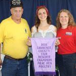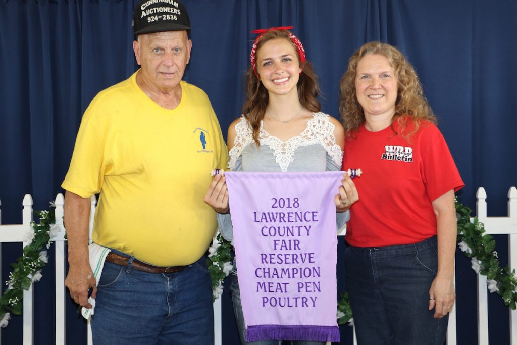 The reserve champion pen of chickens, weighing 16.031 pounds, sold for $7 a pound to Mark (not pictured) and Joy Beers, Weekly Bargain Bulletin, and Mark Cunningham Auctioneer, represented by Rodger Swogger. Jade Horter raised the champion pen.